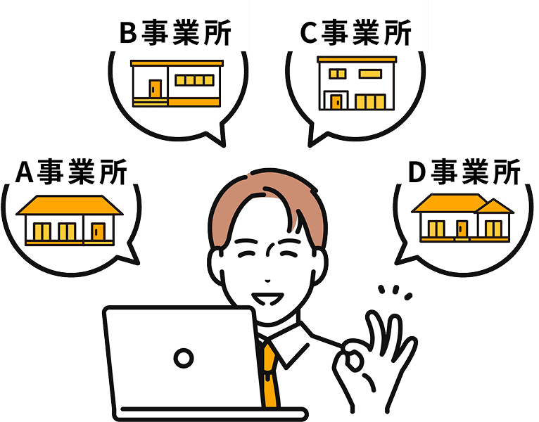 複数事業所がある法人様向けの機能です。1度のログインで複数事業所の管理が可能です。所属する事業所の計画書・報告書・利用請求の帳票を一括で管理できます。更に専用プリンターを導入していただくことにより、利用者ごとに必要な帳票を送付先別に集約、封筒などの印刷から封入まで、全自動で行うことも可能です。